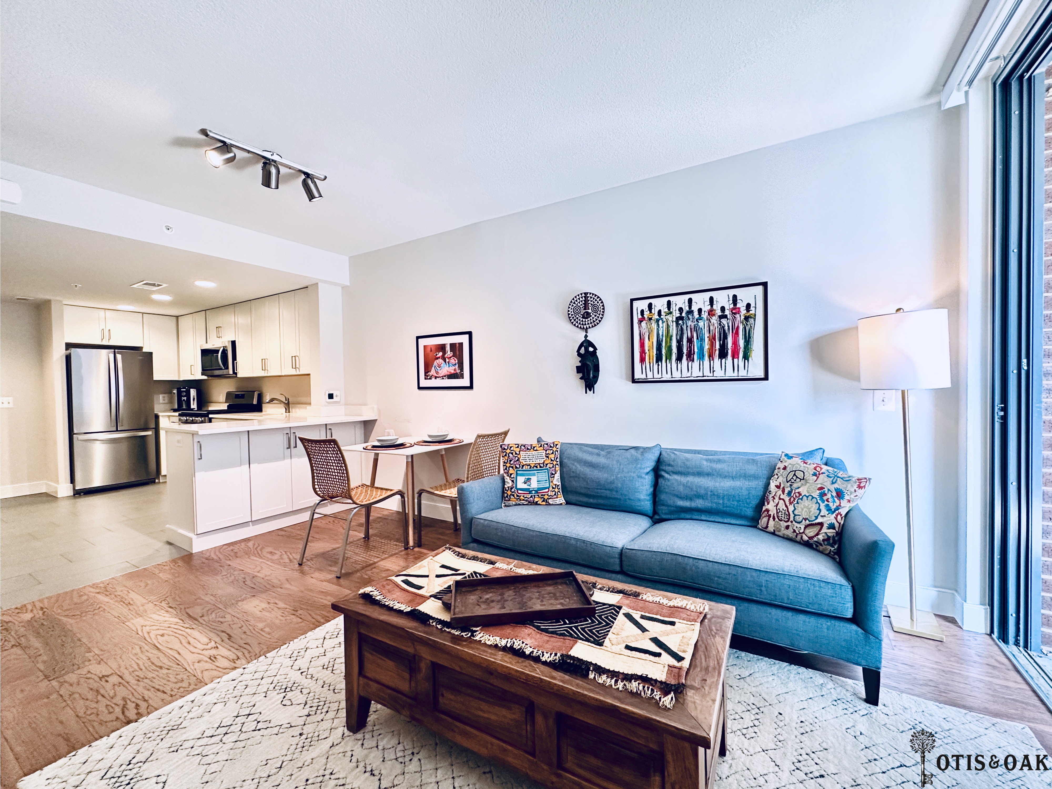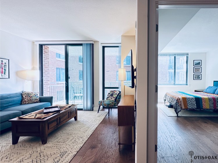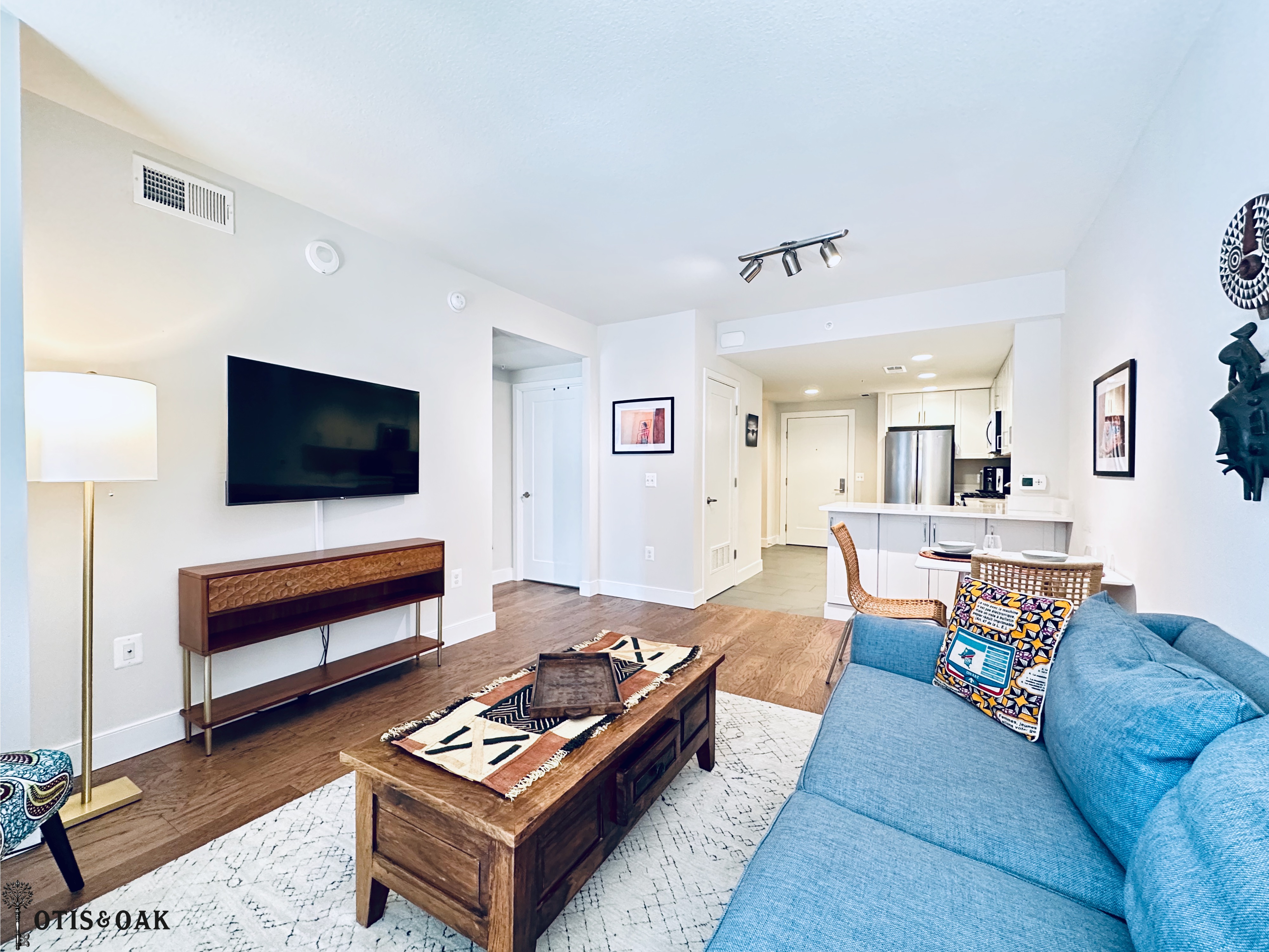 The living room flows seamlessly onto your private balcony overlooking the pool and with a view of the Washington Monument.