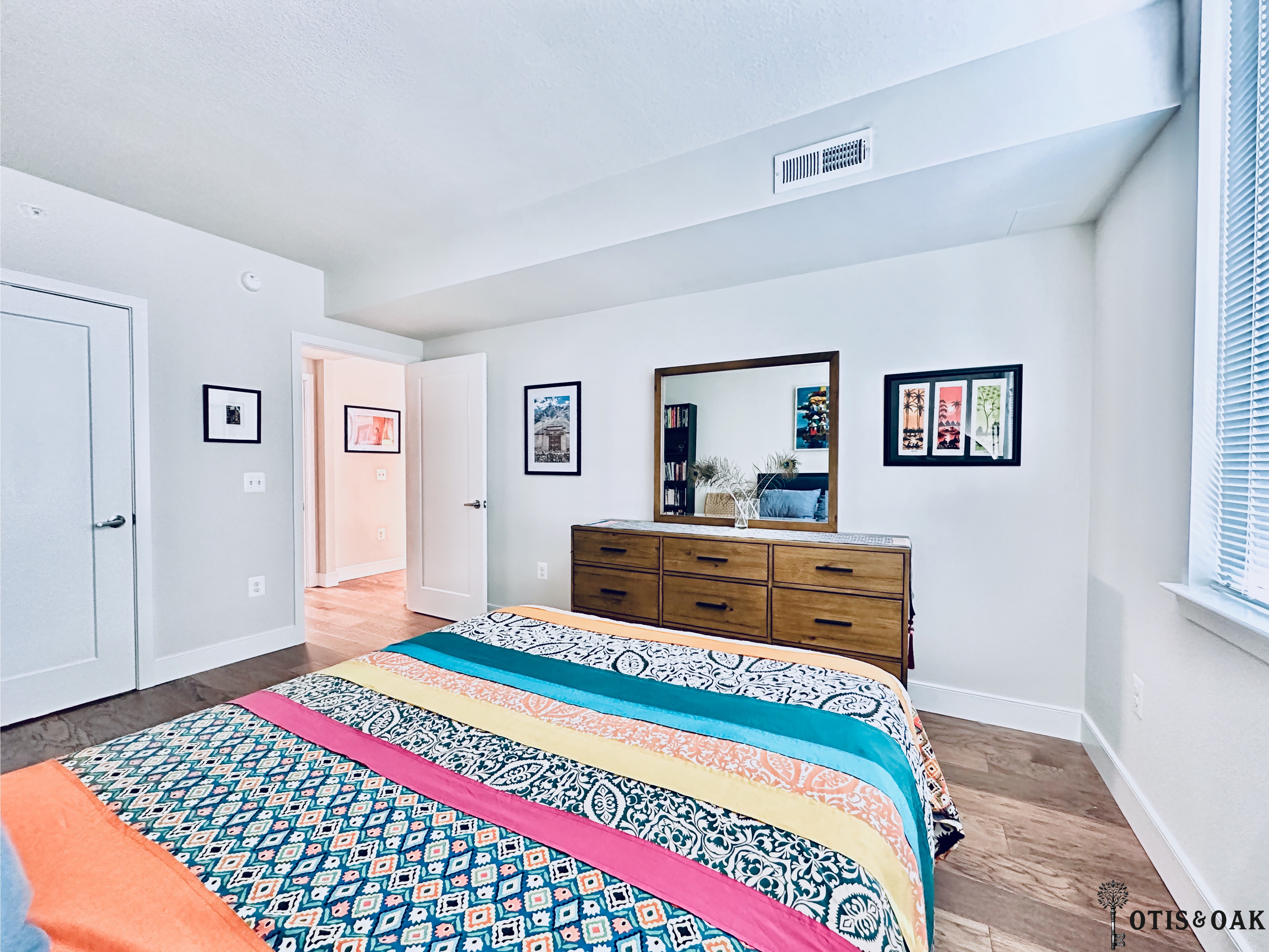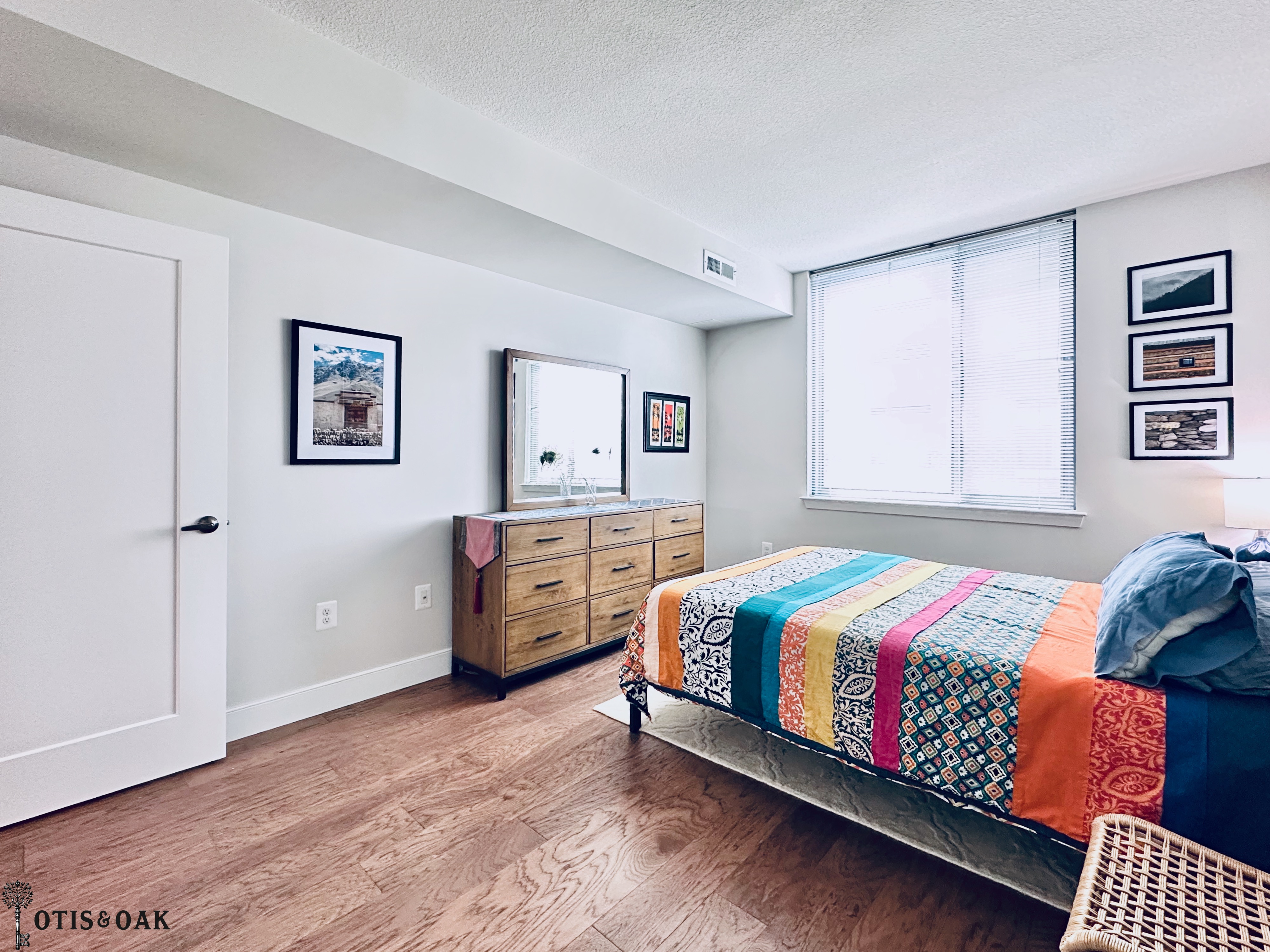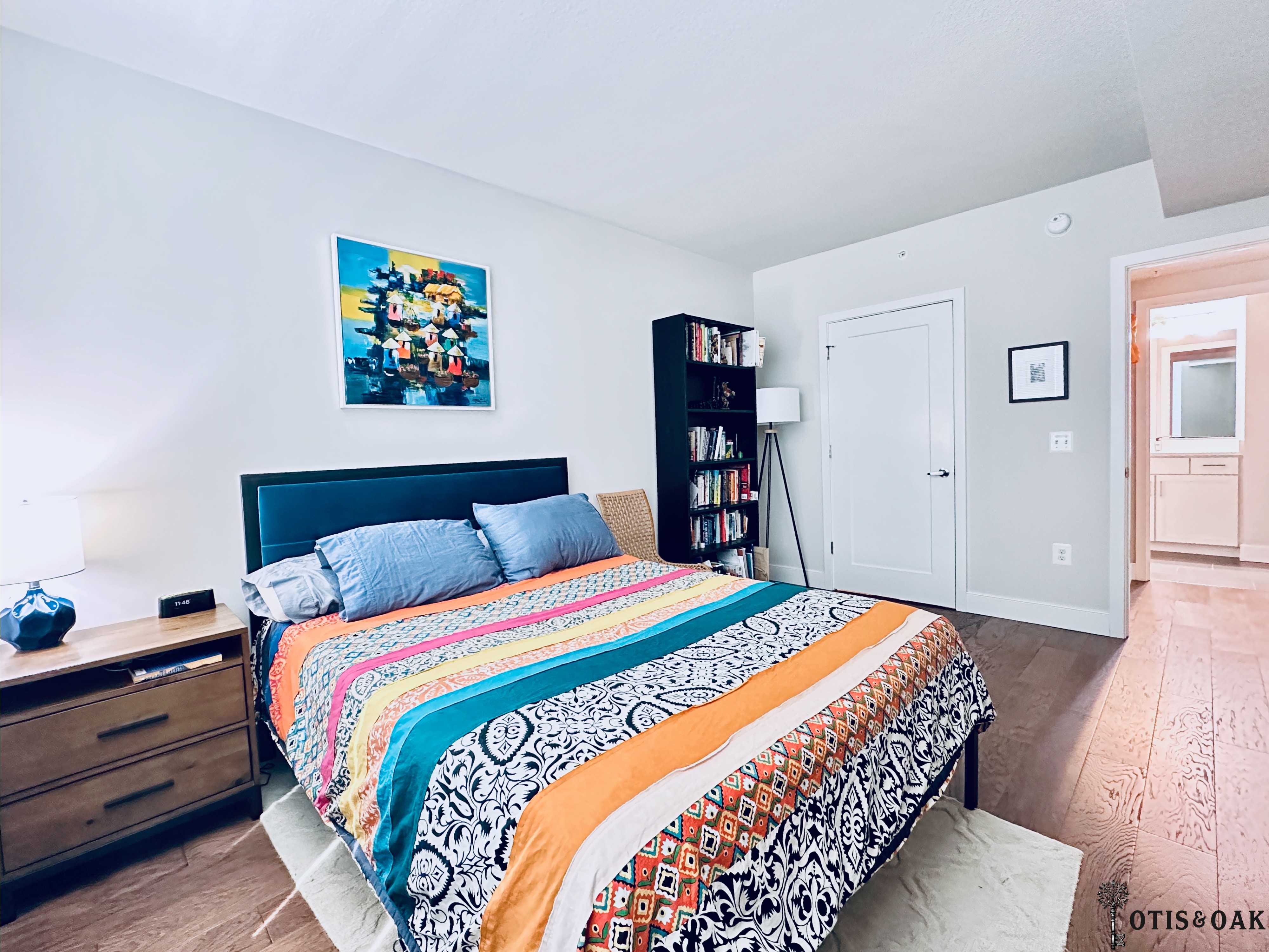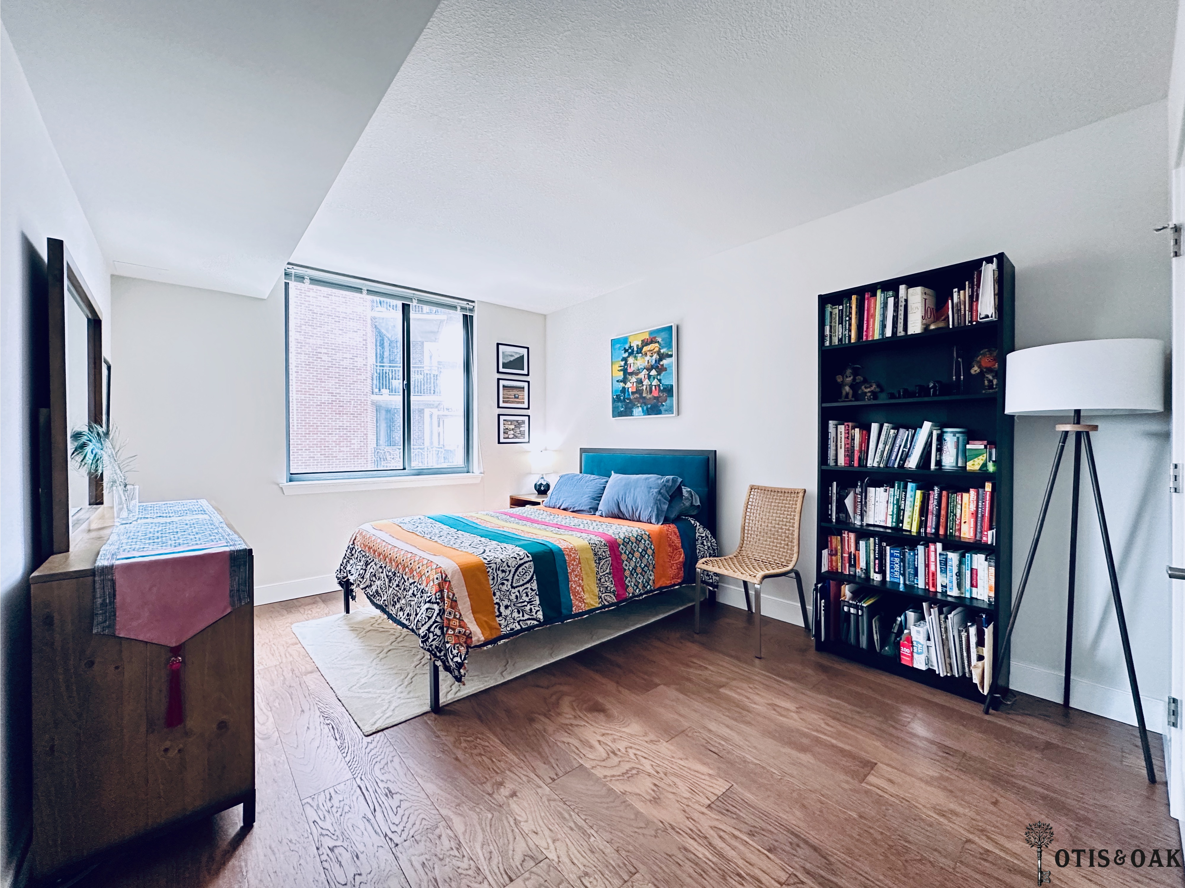 The spacious bedroom offers large south-facing windows, hardwood floors, and a walk-in closet.