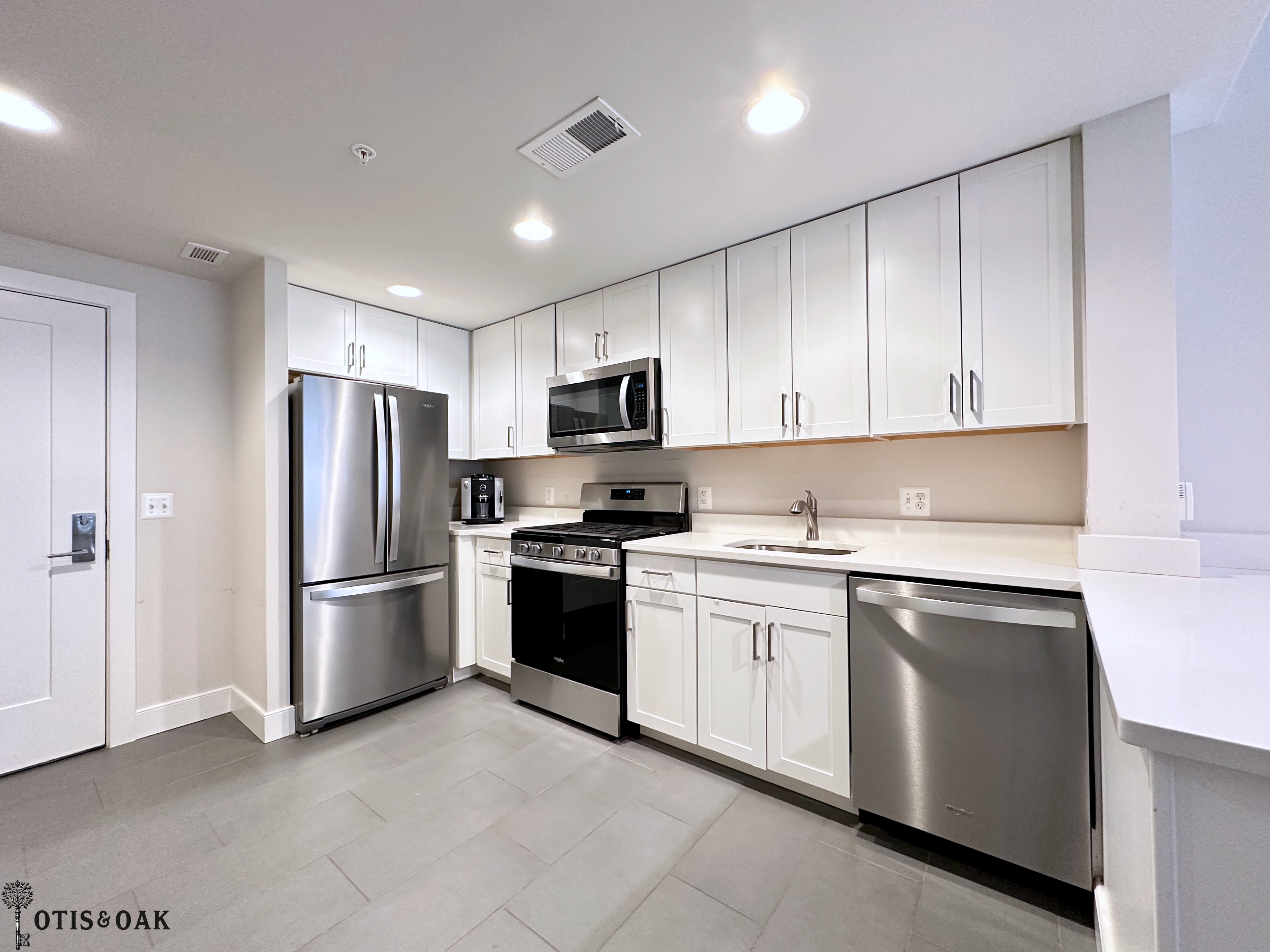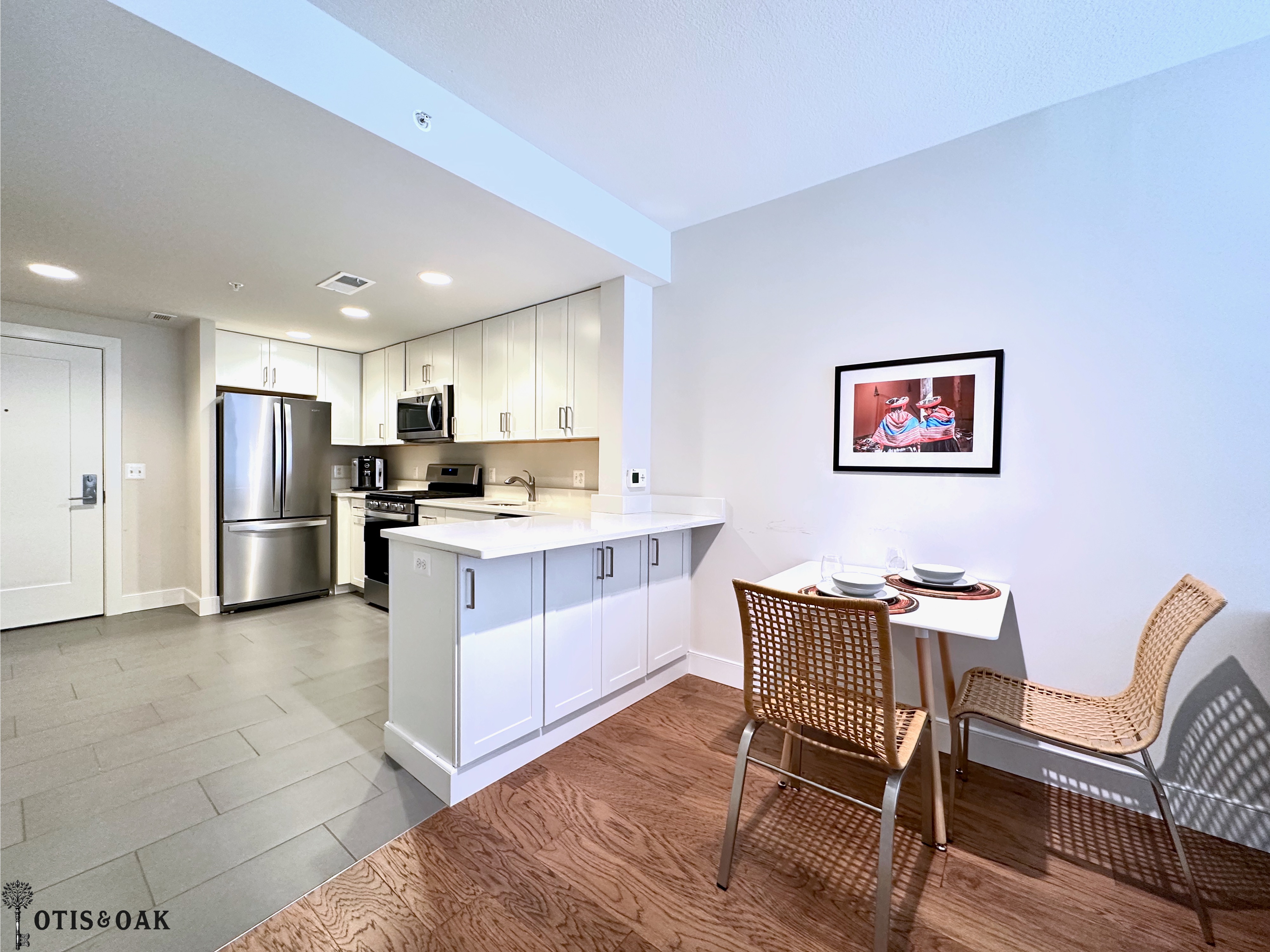 The open kitchen is equipped with a gas range, French-door refrigerator, dishwasher, ample cabinet space, and bar seating, ideal for casual meals and entertaining.