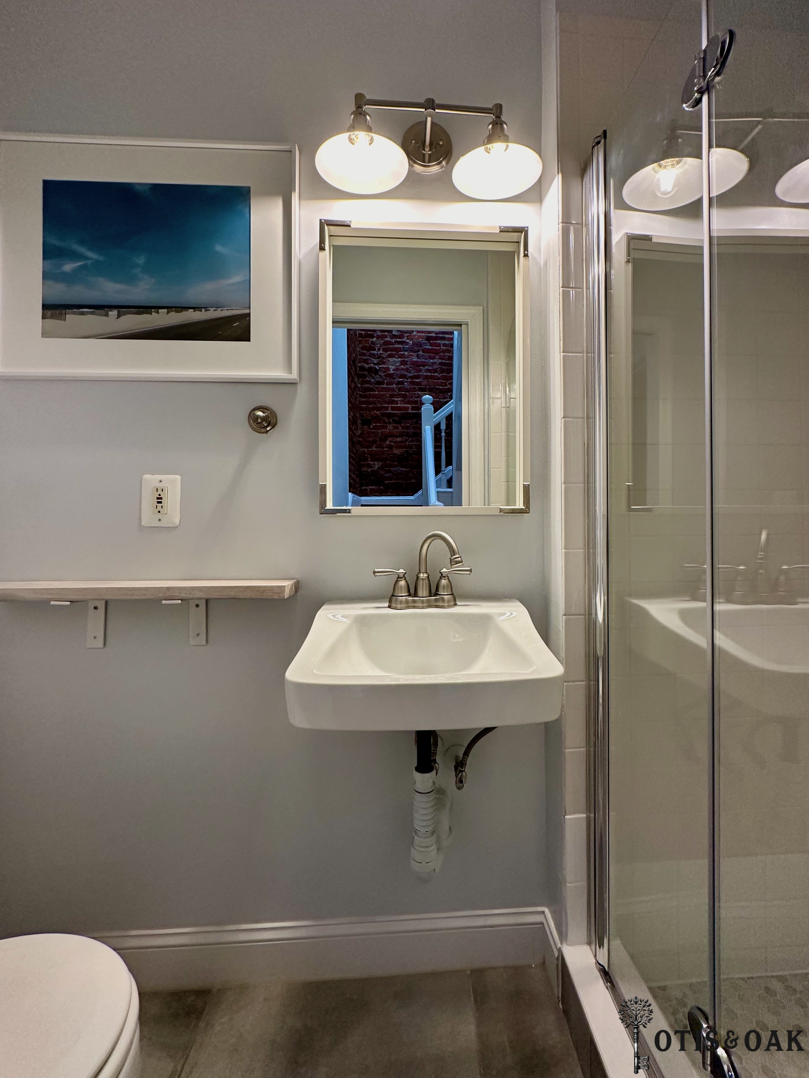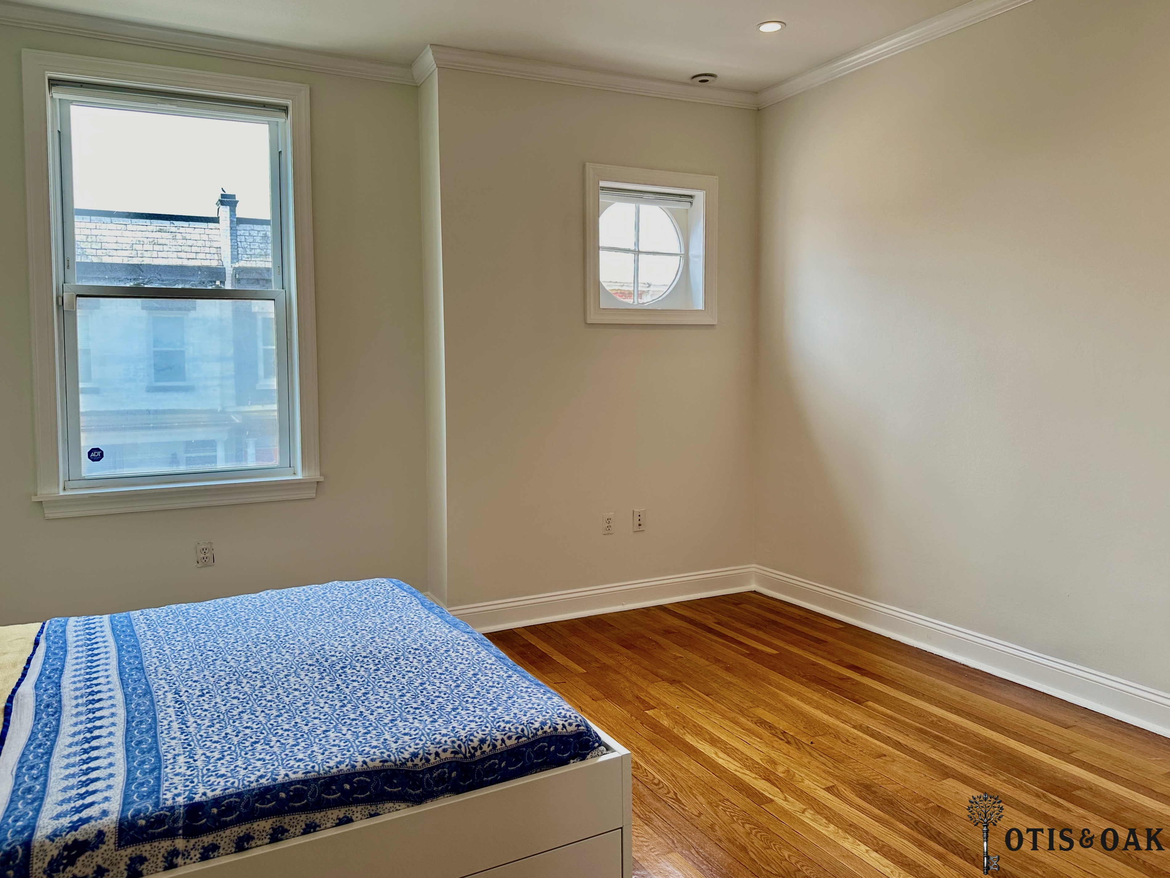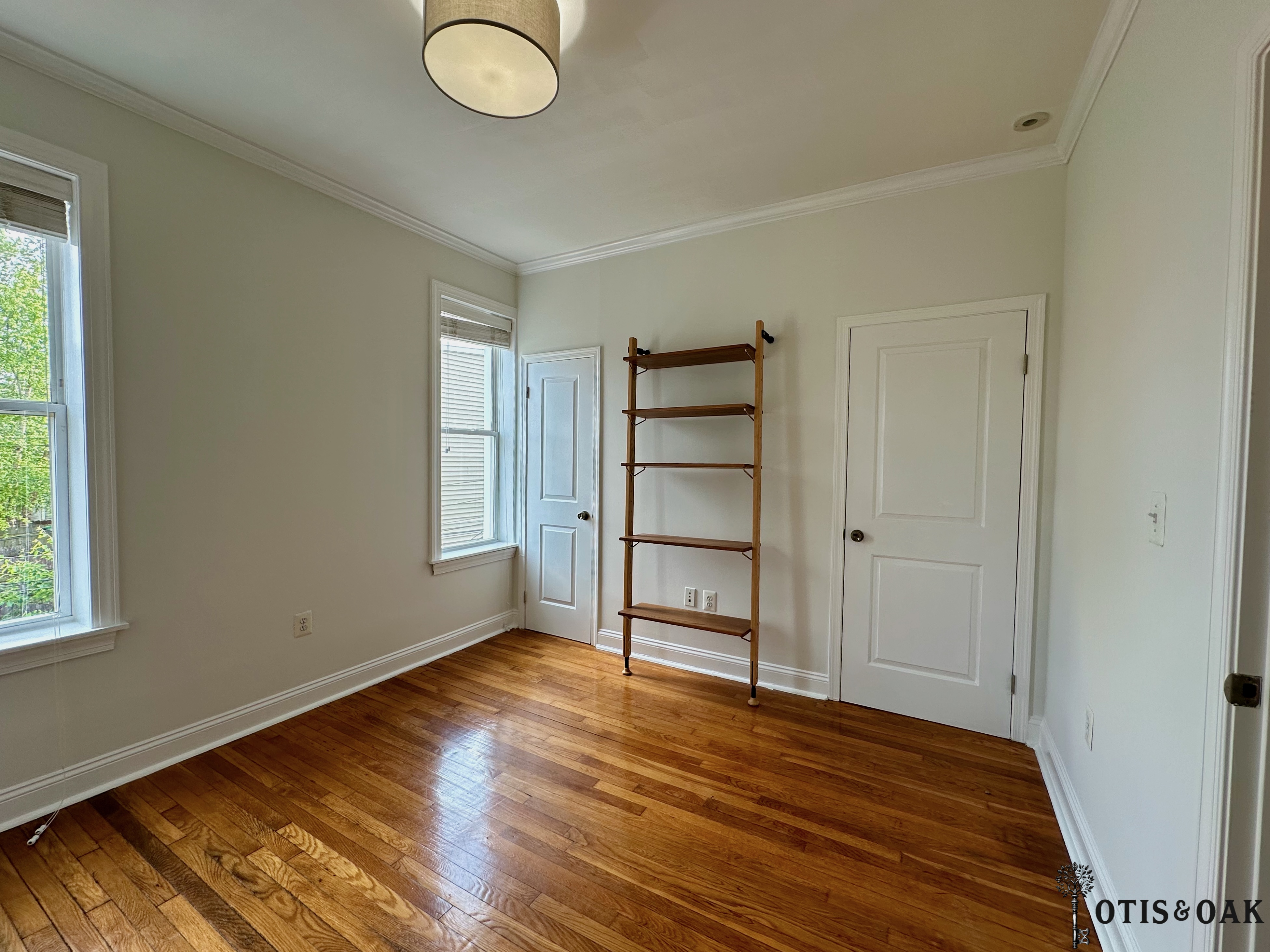 The second floor features two large bedrooms with tons of natural light and storage. They share a full bathroom with a glass-enclosed shower.