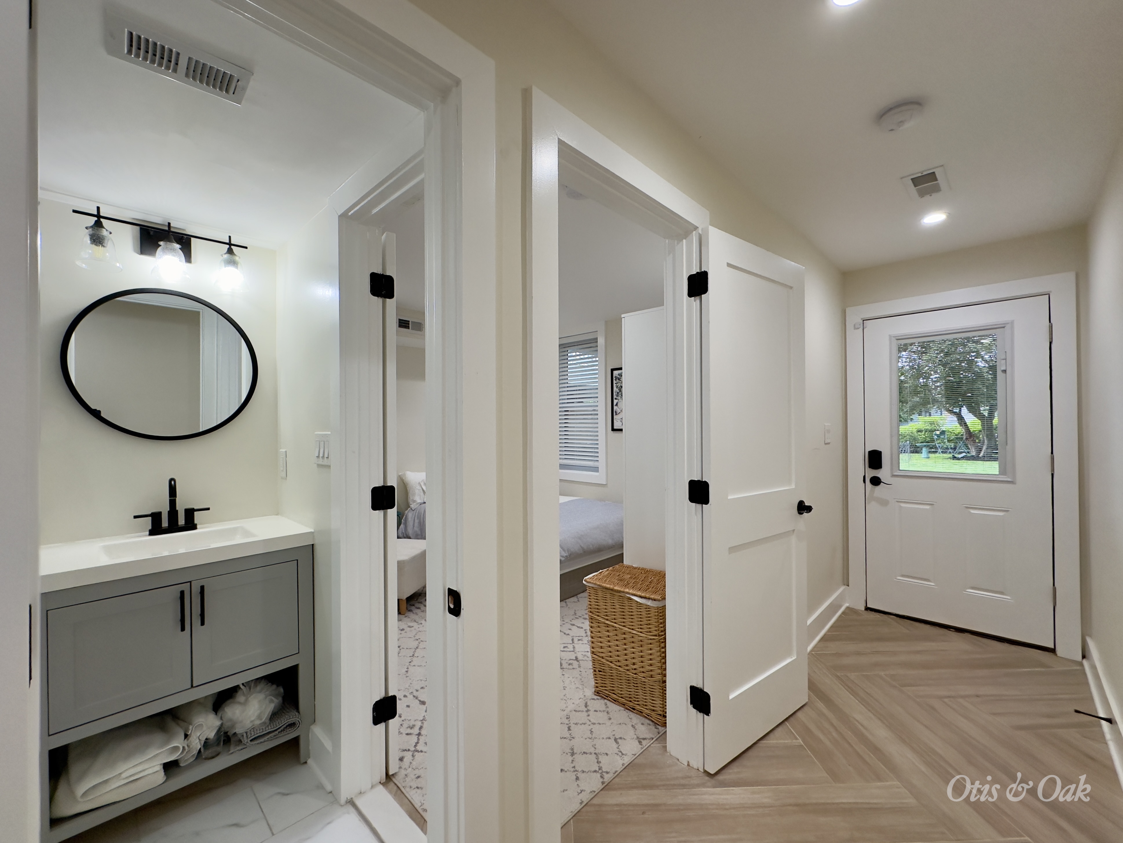 Upstairs, the primary suite spans the width of the house, with space for a king bed, walk-in closet, and luxe en-suite bath.