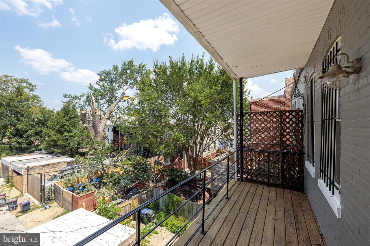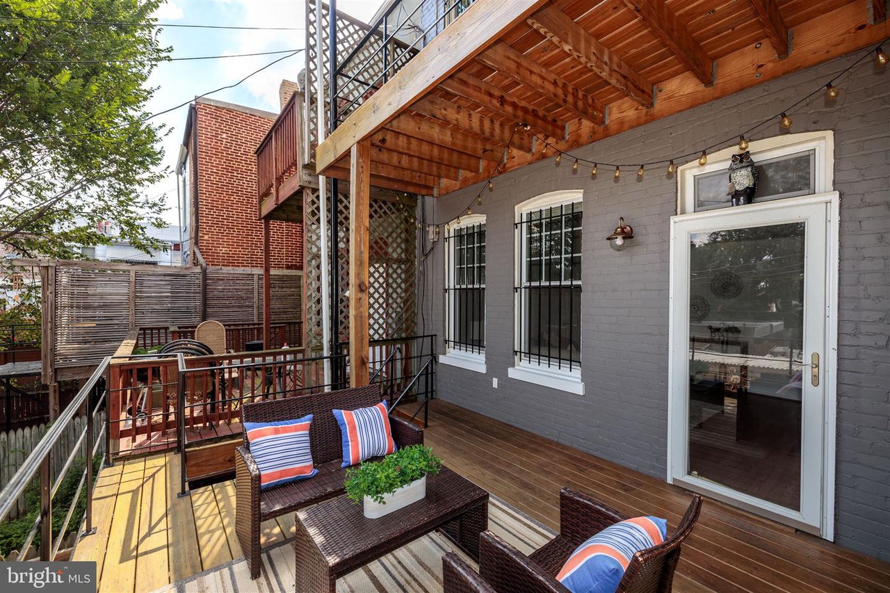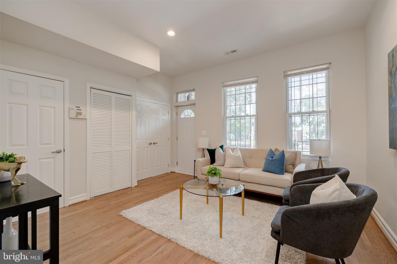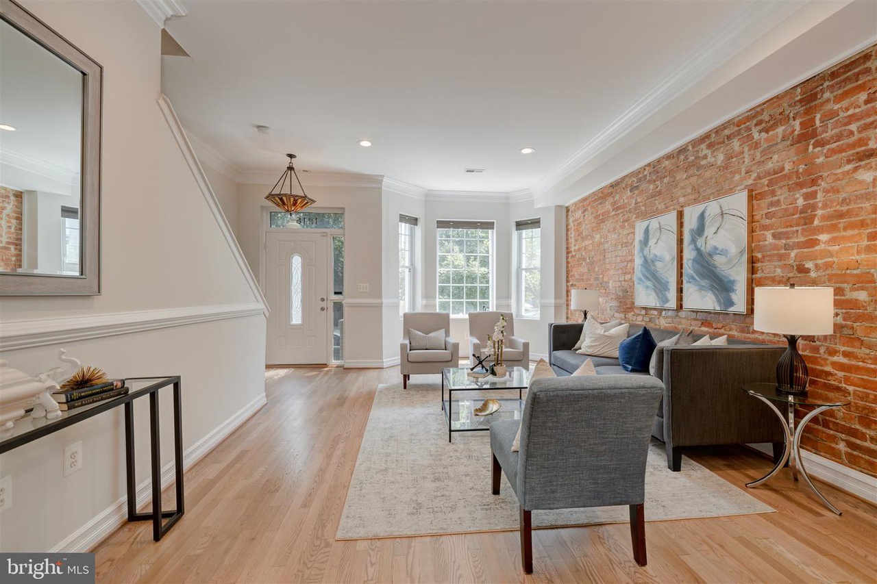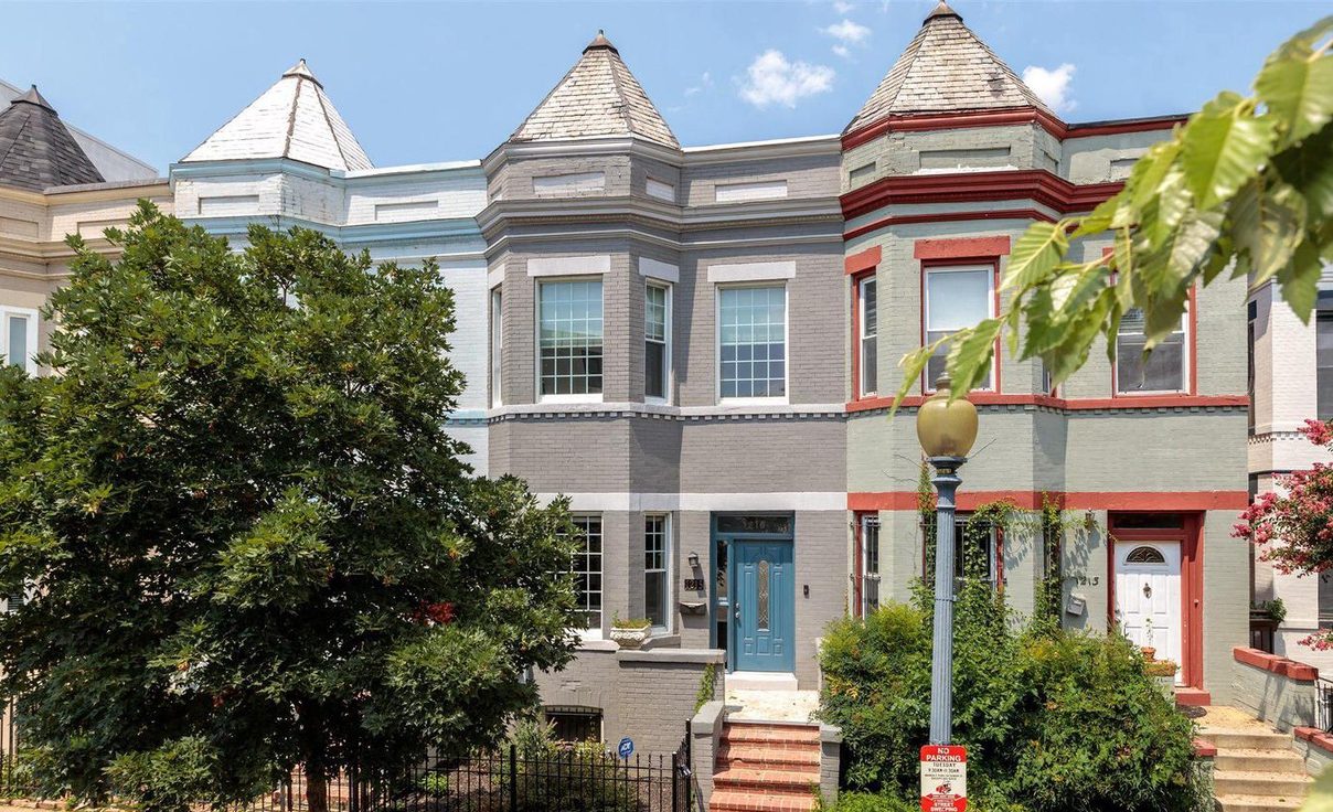 This grand three-story townhouse sits on a quiet street just steps from bustling Columbia Heights