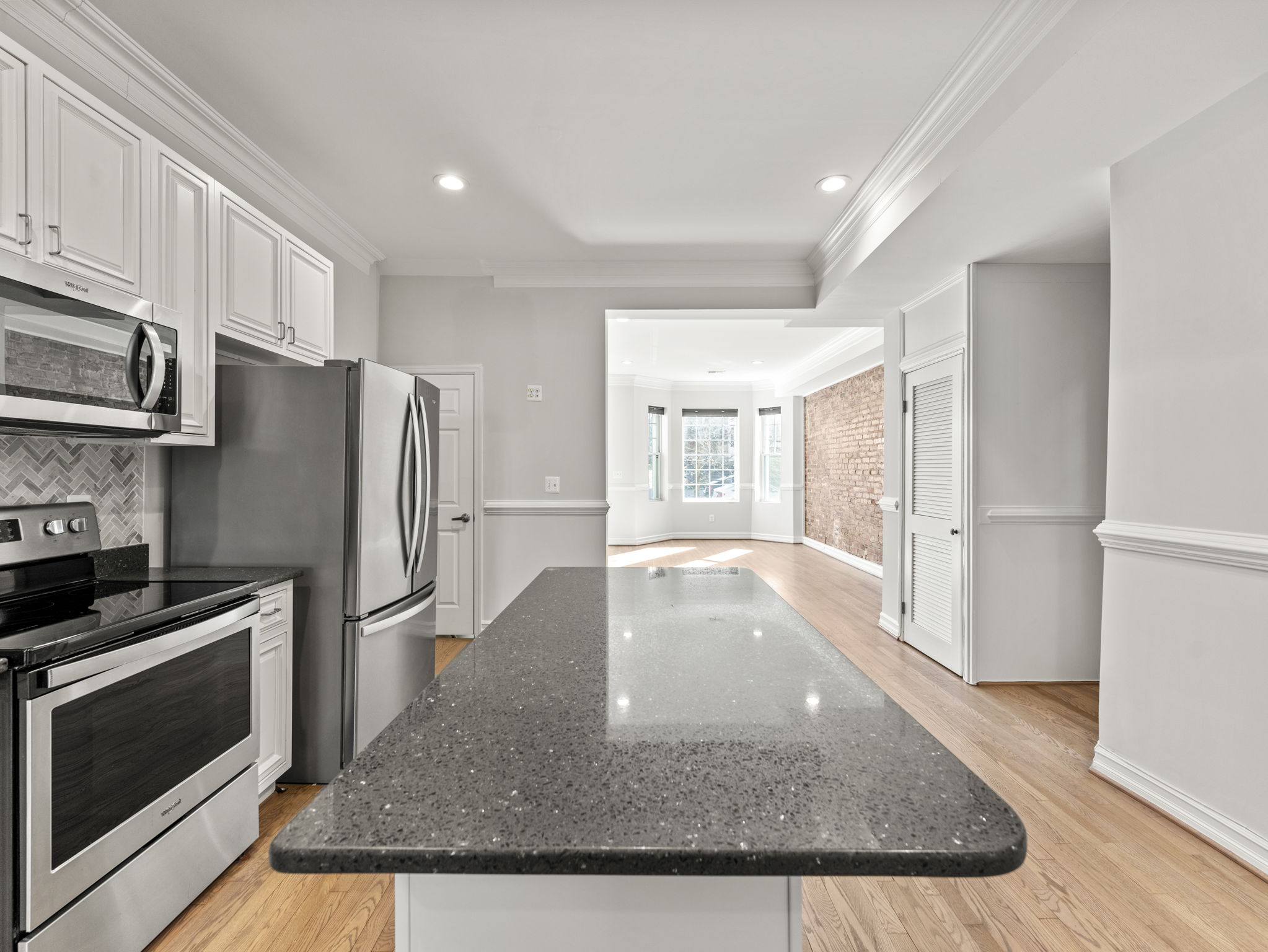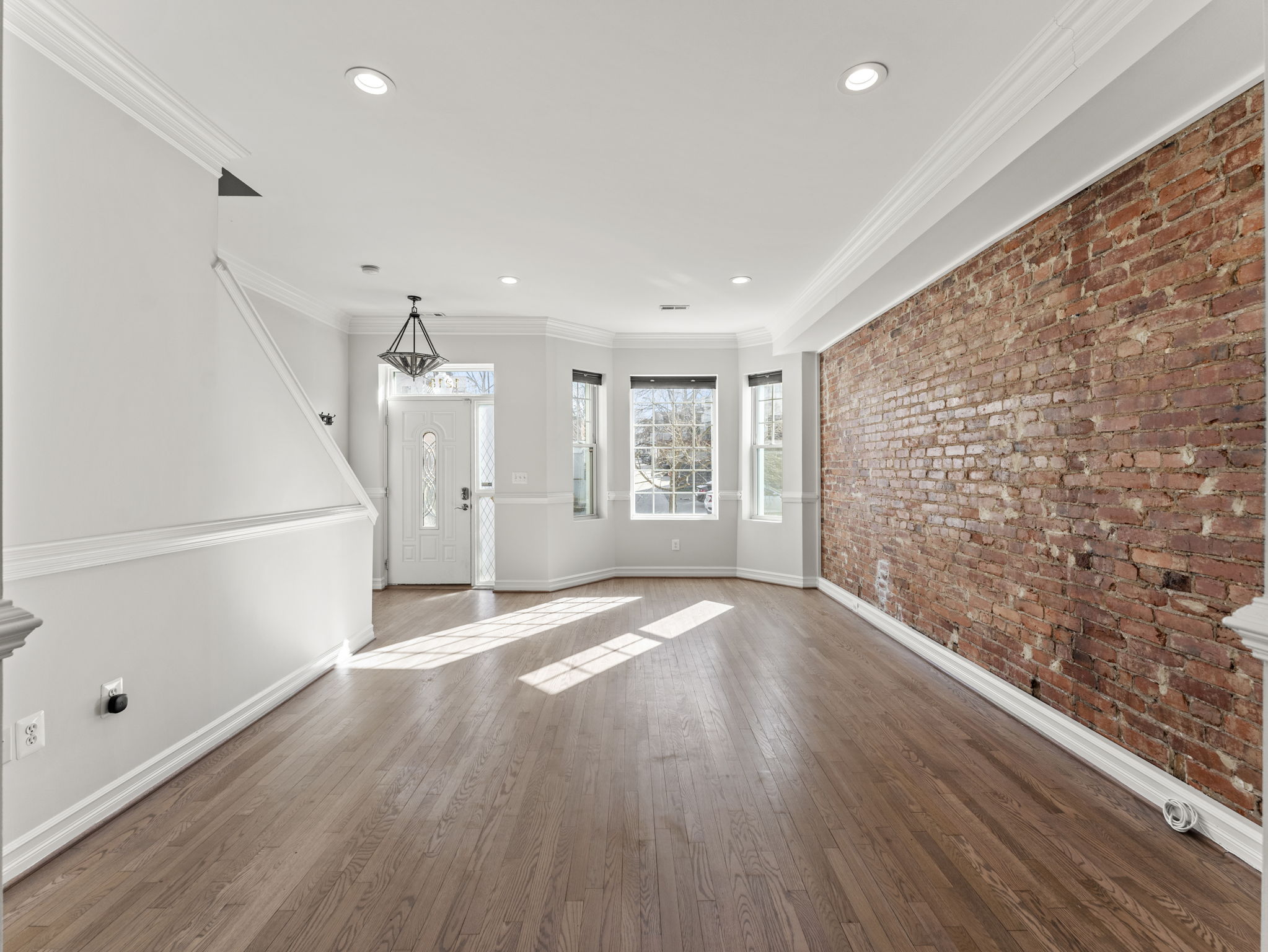 Fully renovated with hardwood floors, exposed brick, stainless steel appliances, and central heating/AC