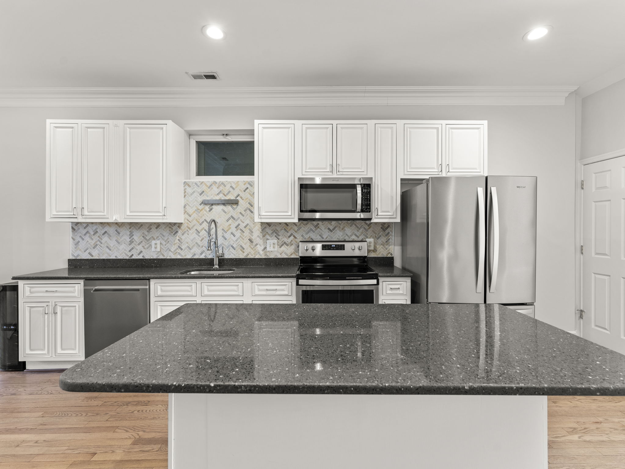 The entry and living areas feature massive south-facing windows which receive tons of natural light. The spacious kitchen is equipped with granite countertops, stainless steel appliances, dishwasher, and a wine refrigerator. The large back room can be used as a bedroom, second living area, or a spacious light-filled home office. The main floor is completed by a full bathroom and a washer and dryer.