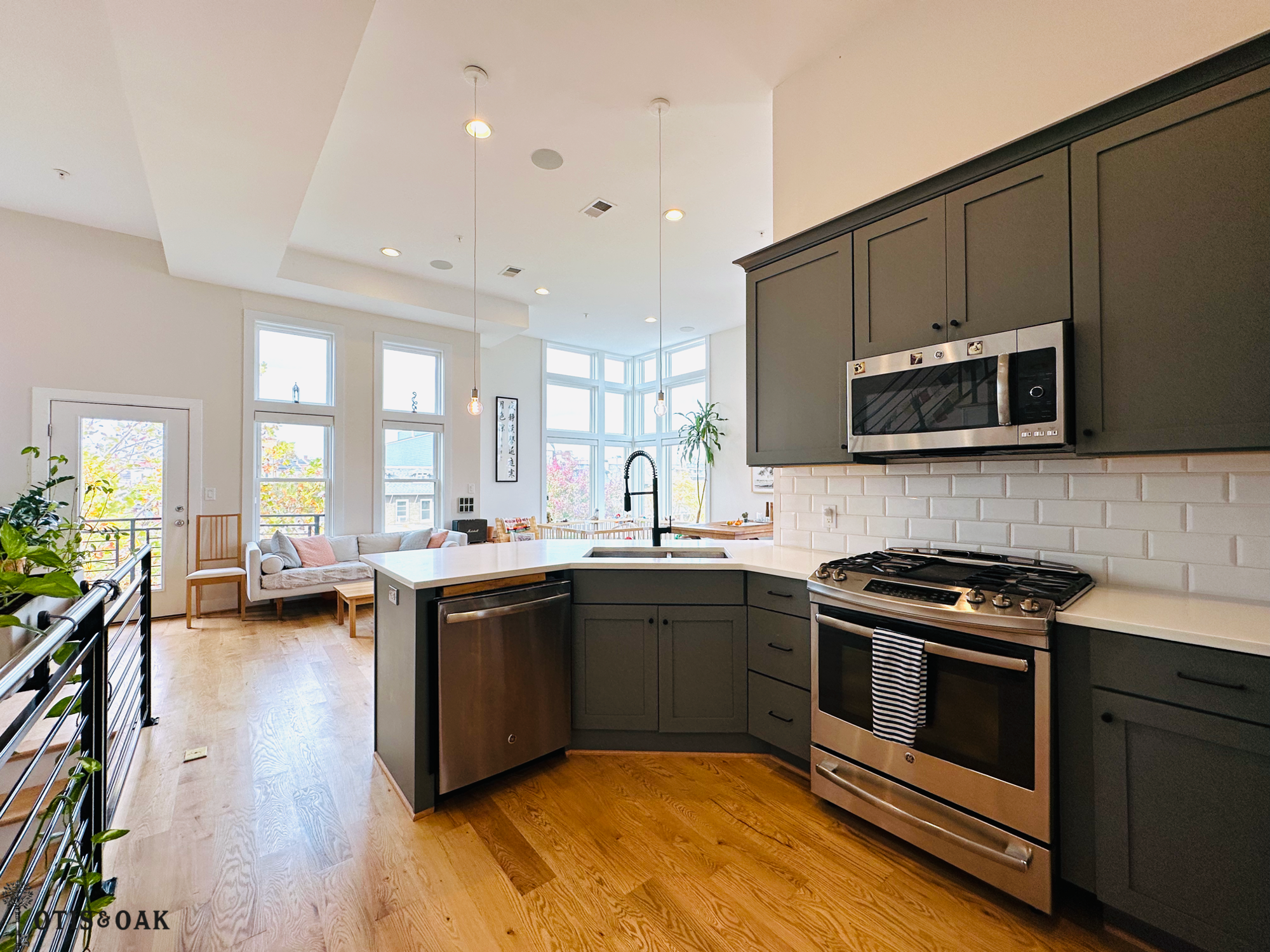The gourmet kitchen is equipped with a gas range, dishwasher, microwave, refrigerator, stone countertops, and an eat-in bar. The kitchen looks out onto spacious living and dining areas, perfect for entertaining or relaxing. Two balconies on the main level provide peaceful spots to sip your morning coffee or cultivate your own urban garden.