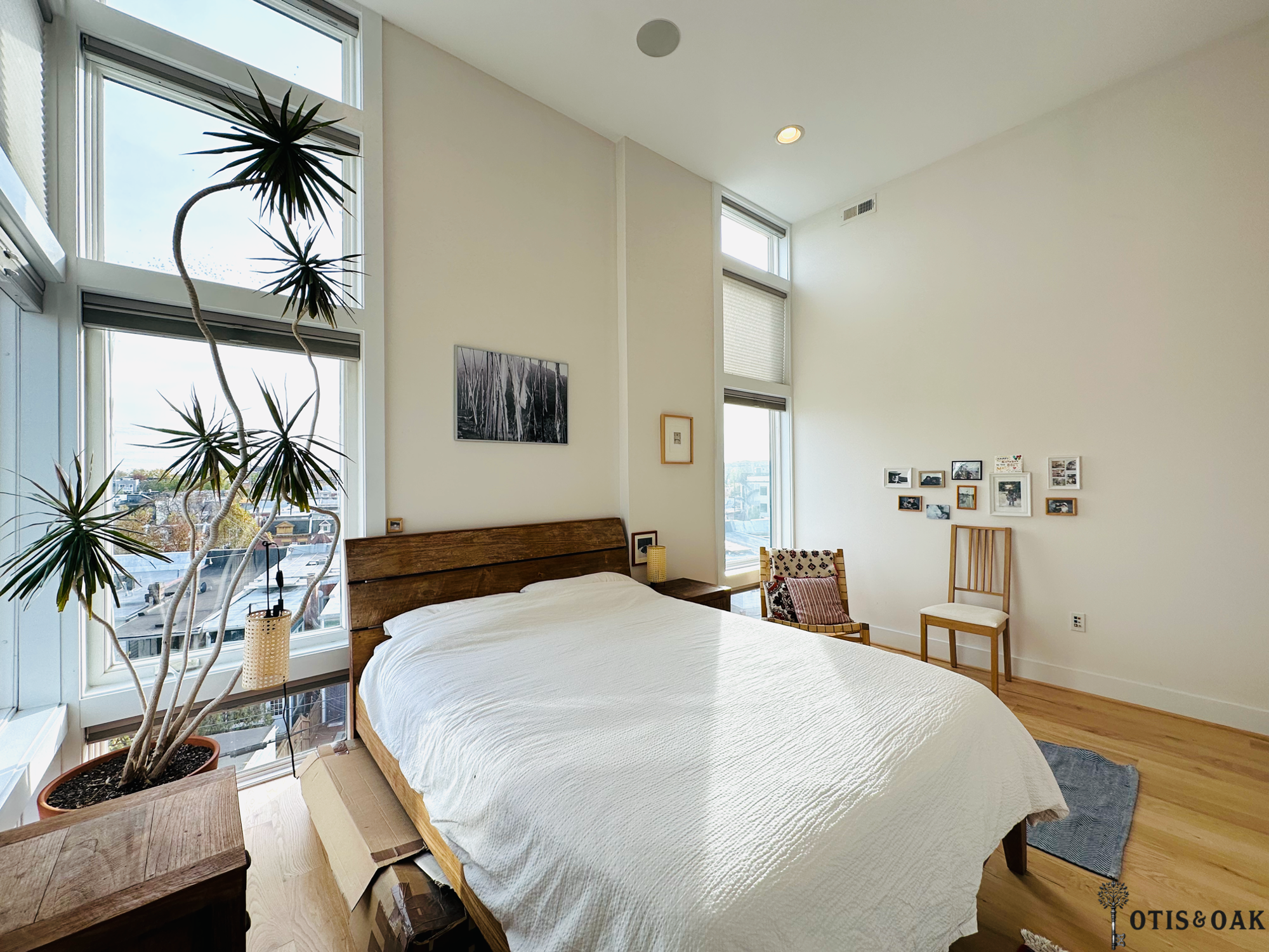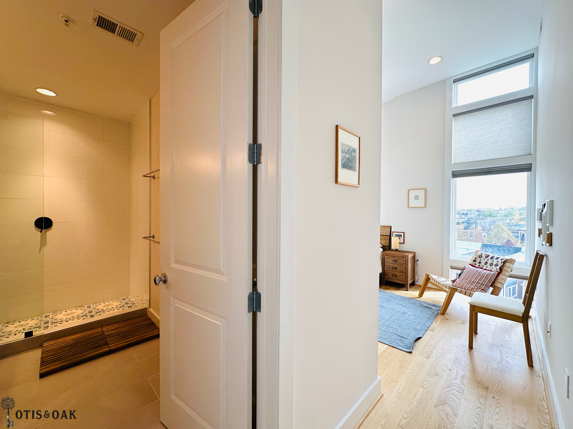 The serene primary suite features floor-to-ceiling windows with motorized shades, and a spacious en-suite bathroom.